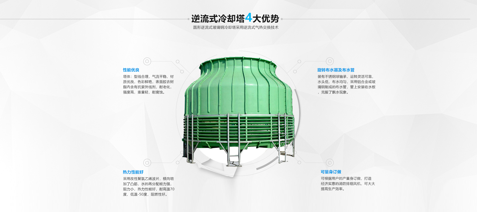 圓形冷卻塔-圓形逆流式閉式冷卻塔里面填料是PVC淋水片,以擴散淋水面積,利用旋轉布水形式,實現布水均勻,以加強到冷卻的效果,···